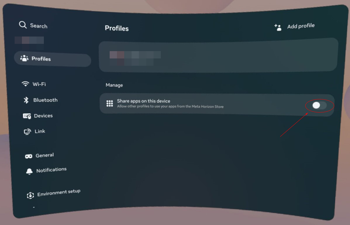 Compartir juegos entre las cuentas que tengáis en vuestras Quest es muy sencillo. Simplemente debéis entrar en los ajustes de las Quest, seleccionar el apartado de perfiles y para terminar, activar la unica opción que os aparecerá en esa sección (ver imagen). Tened en cuenta que el menú y los subapartados pueden cambiar dependiendo de la versión de Meta Horizon que tengais, por lo que la opción puede encontrarse en otro sitio, pero por norma deberiáis tenerla en ese apartado o en el centro de cuentas.
